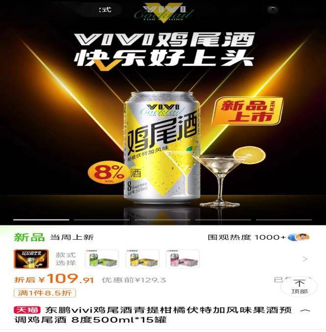 1月15日,东鹏饮料通过官方微信公众号官宣了新品“VIVI鸡尾酒”。据了解,东鹏饮料鸡尾酒新品包含柑橘、青提、白桃三种伏特加风味,规格为15罐/箱,建议零售价为9元/罐。