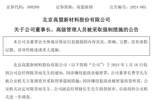 1月17日早间,高盟新材发布公告称,公司于2024年1月16日收到公司总经理陈登雨先生的通知,因涉嫌侵犯商业秘密罪,公司董事长曹学先生被公安机关立案调查并采取刑事强制措施;因涉嫌侵犯商业秘密案侦查所需,公安机关决定对陈登雨先生、公司副总经理赫长生先生取保候审。目前尚待公安机关进一步调查。