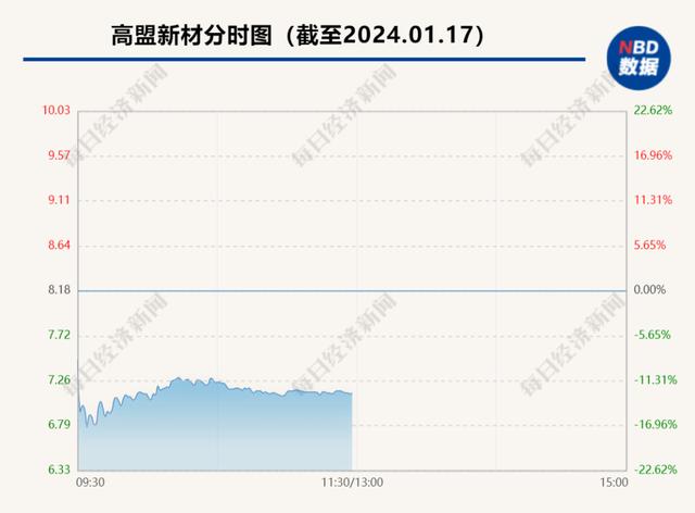 高盟新材股价应声大跌,盘中一度跌超17%。截至中午休市,高盟新材股价大跌12.84%,报7.13元,总市值30.37亿元。