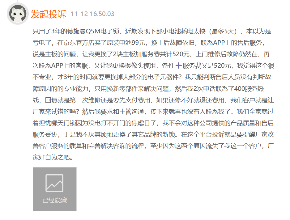 也有投诉者称使用了3年的德施曼Q5M电子锁,出现了耗电快的问题。售后先是更换主板,又再更换摄像头模组。他不满使用3年的产品就要更换大部分元件,同时质疑售后人员没有判断故障的专业能力,只能通过换新元件解决问题,加重了用户负担。