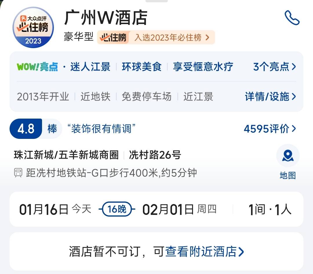 公开的资料显示,广州W酒店位于广州市天河区冼村街道,珠江新城繁华地段,是中国内地首家W酒店,归属万豪国际集团所有。酒店拥有317间客房,平日预订价格在1100元-1700元之间,同时拥有定价在3000元以上的套房。