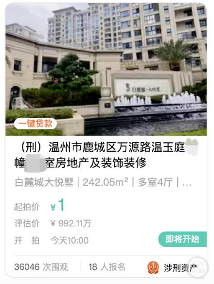 1月16日10时,在司法拍卖网站法拍房网页,起拍价仅1元的浙江温州一套价值上千万元的别墅引发网友关注。