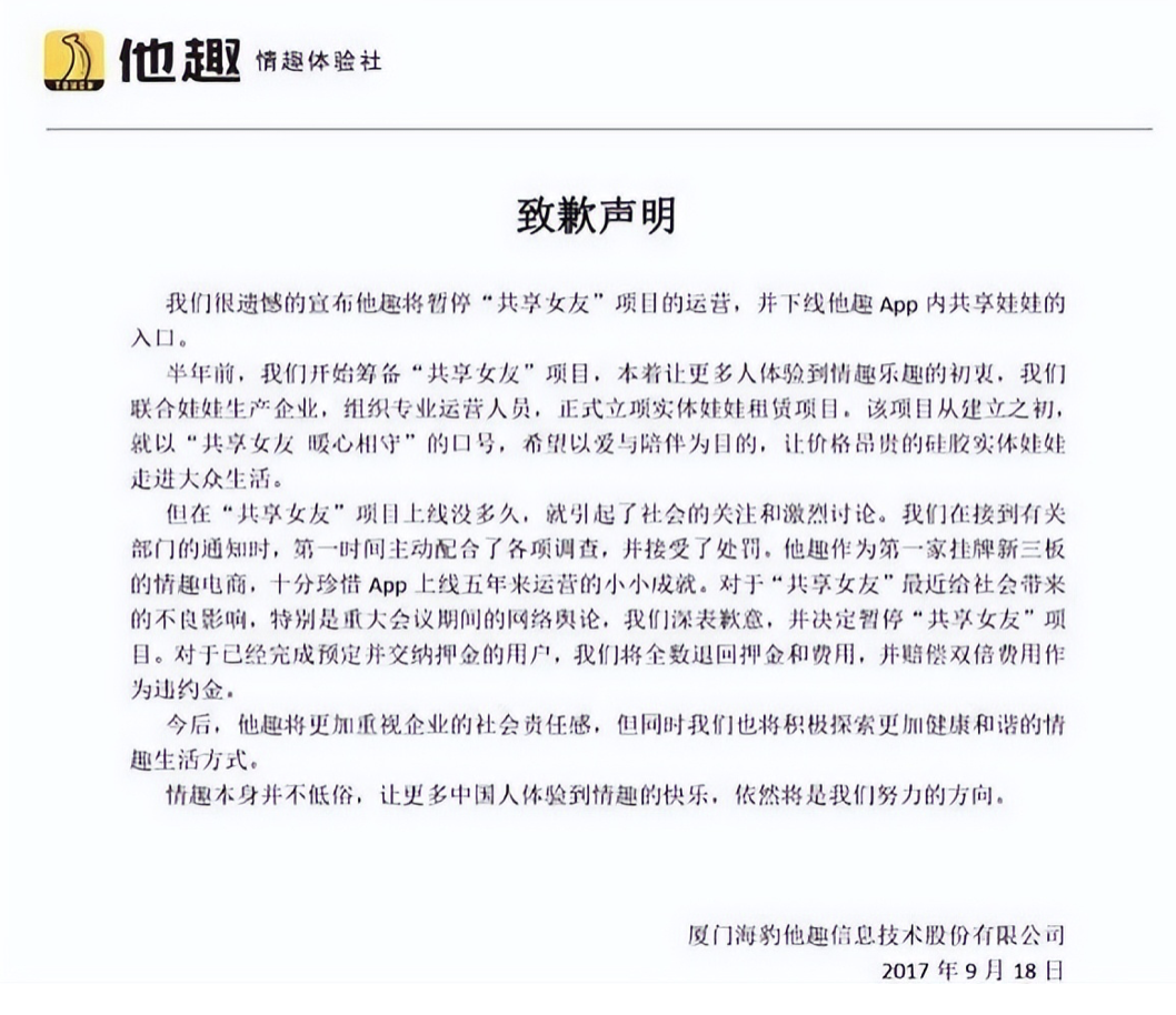 9月18日,他趣APP背后的公司“厦门海豹他趣信息技术股份有限公司”发表了致歉声明,宣布暂停“共享女友”项目的运营,对该项目为社会带来的不良影响深表歉意,同时,该公司还承诺,对于已经交了押金的用户,他们将退还双倍费用作为违约金。