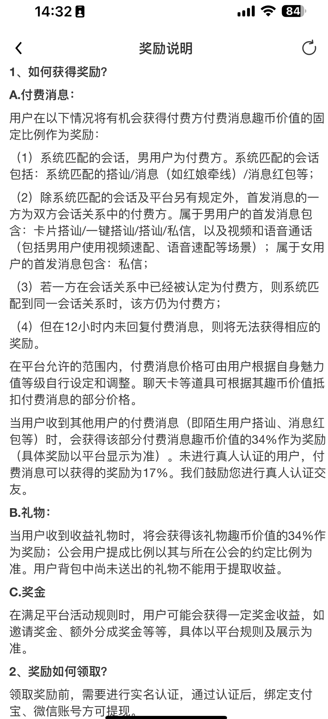《消费者报道》记者留意到,作为覆盖用户达2亿的婚恋交友平台,该软件的付费模式主要针对男性用户。奖励说明显示,系统匹配的会话,男用户为付费方。系统匹配的会话包括:系统匹配的搭讪/消息(如红娘牵线)/消息红包等。也就是说,男用户向女用户发送消息需要付费才能进行。