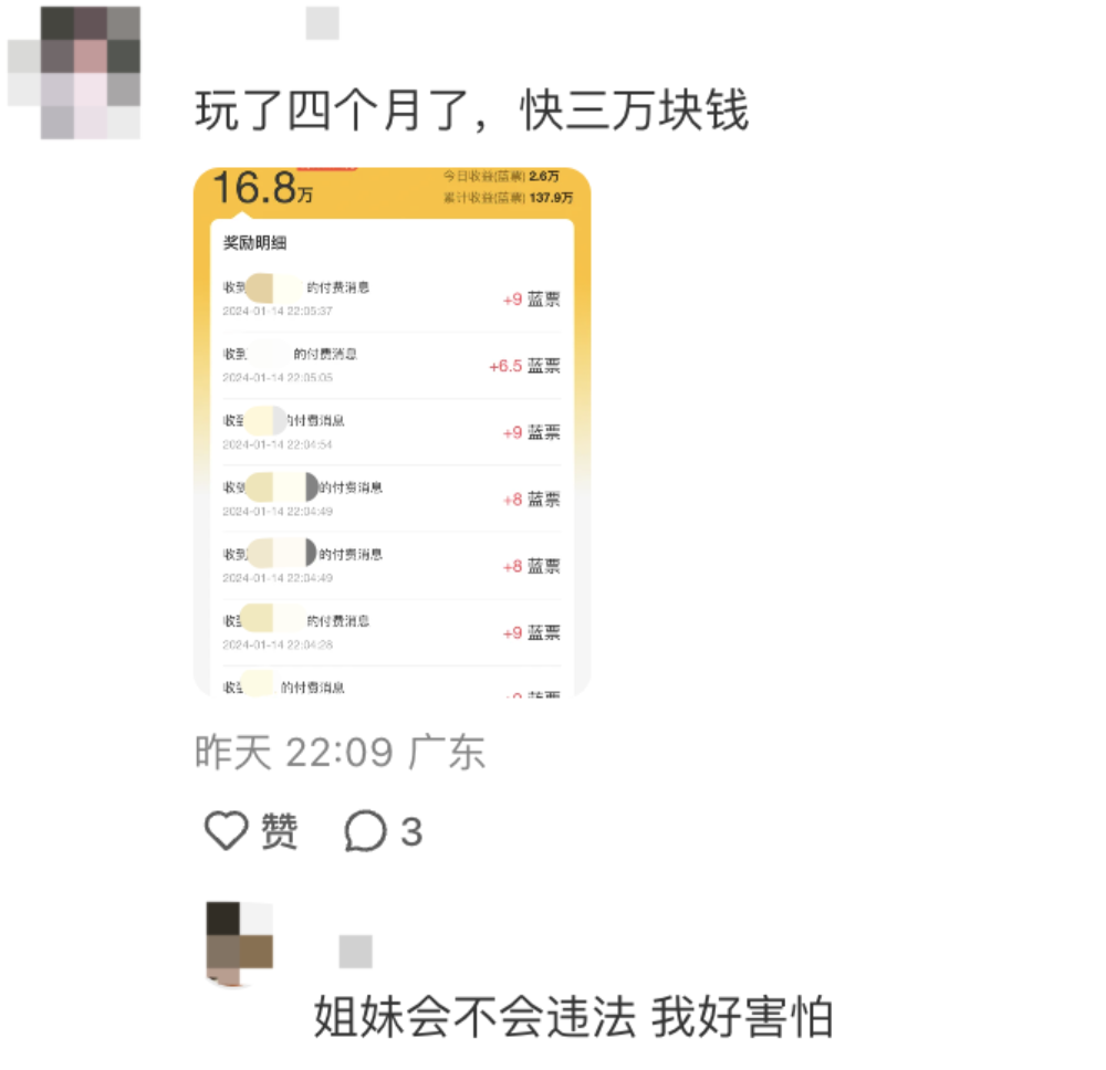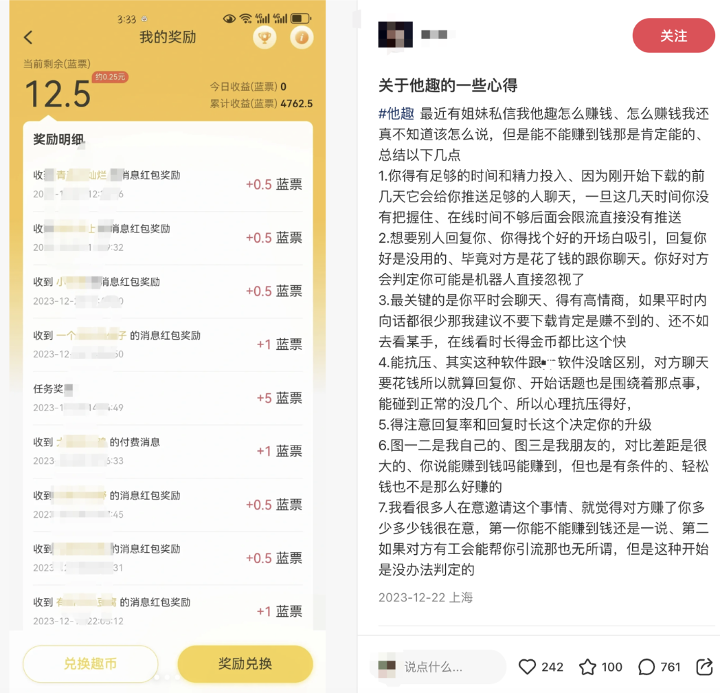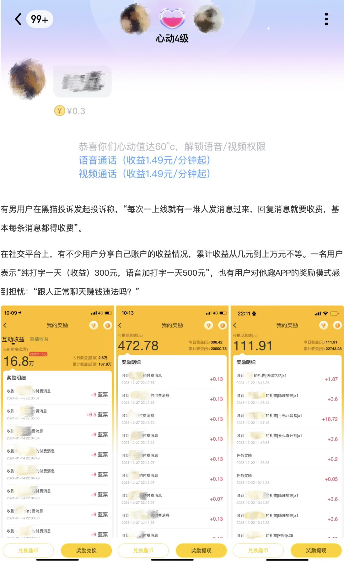 在社交平台上,有不少用户分享自己账户的收益情况,累计收益从几元到上万元不等。一名用户表示“纯打字一天(收益)300元,语音加打字一天500元”,也有用户对他趣APP的奖励模式感到担忧:“跟人正常聊天赚钱违法吗?”