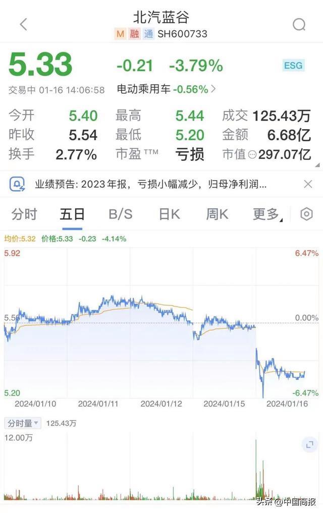 在二级市场上,1月16日,北汽蓝谷的股价盘中跌3.79%,报5.33元,总市值为297.07亿元。