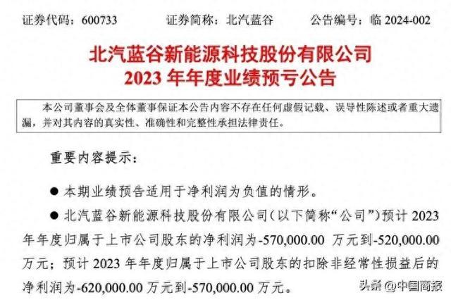 1月15日晚间,北汽蓝谷公布业绩预告,该公司预计2023年归母净利润亏损52亿—57亿元。这已经是该公司连续第四年大幅亏损超50亿元。
