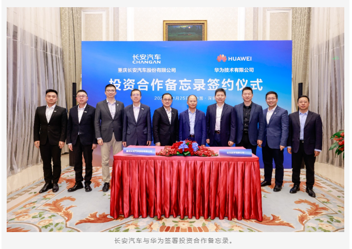 据长安汽车公众号,长安汽车与华为于2023年11月25日在深圳签署了《投资合作备忘录》。经协商,华为拟成立一家新公司,聚焦智能网联汽车的智能驾驶系统及增量部件的研发、生产、销售和服务。华为轮值董事长徐直军,华为常务董事、智能汽车解决方案BU董事长余承东,长安汽车董事长、党委书记朱华荣,长安汽车总裁王俊,长安汽车党委副书记谭本宏,长安汽车纪委书记蒲星川,长安汽车副总裁王辉等出席活动。