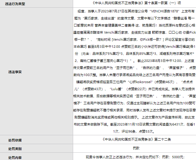 据北京市场监管局网站处罚信息显示,经市场监管局调查,当事人闻绮(北京)商贸有限公司于2023年7月27日在其微信公众号“VENCHI源自1878”上发布宣传文章,文章中有“评论区留言分享你的本命黑巧截至8月3日中午12:00点赞前三名的小伙伴还可获得[Venchi黑巧福袋]各1份(内含:品味系列75%黑巧*3、品味系列85%黑巧*3、减糖系列特浓黑巧薄片*2、扁桃仁酱榛子酱三层夹心黑巧*1)”的表述。