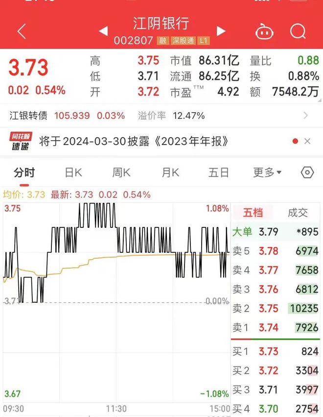 1月15日收盘,江阴银行股价报3.73元,总市值81亿元。