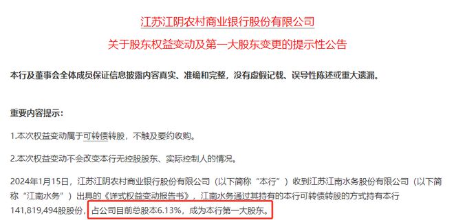 江阴银行表示,1月15日,收到江南水务出具的《详式权益变动报告书》,江南水务通过其持有的本行可转债转股的方式持有本行1.42亿股股份,占公司目前总股本6.13%,成为本行第一大股东。