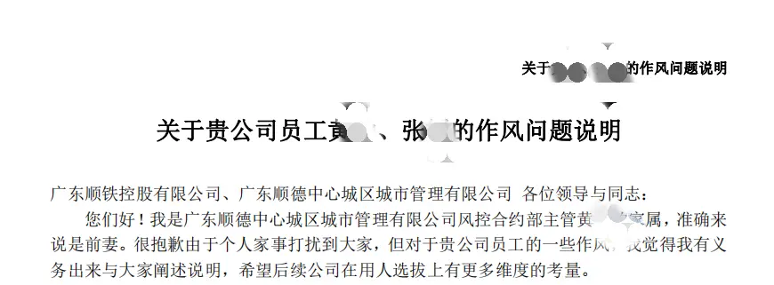 据悉,这名女子自称为广东顺德中心城区城市管理有限公司风控合约部主管黄某的前妻,这份材料详细阐述了她与黄某相恋、结婚,以及黄某与部门同事张某出轨的过程,其中或涉及作风不正问题,她请求纪检部门介入。