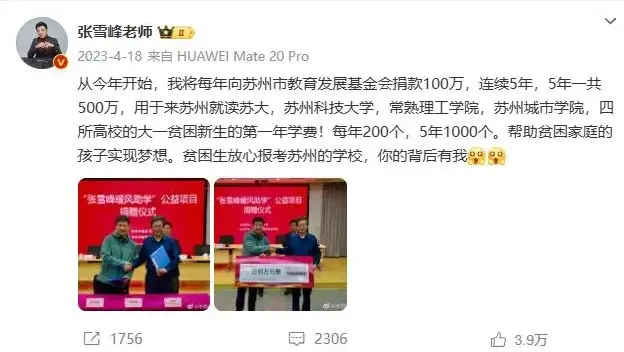 从张雪峰微博中可以发现,这不是他首次捐款。2023年4月18日,张雪峰发文称将每年向苏州市教育发展基金会捐款500万。