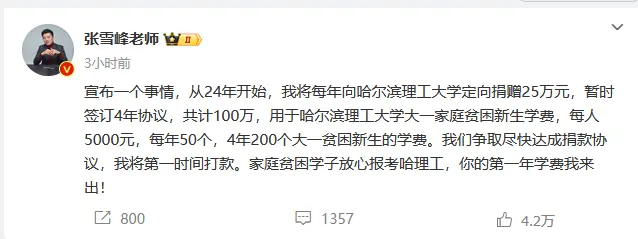 1月15日,微博@张雪峰老师 发文宣布:从2024年开始,将每年向哈尔滨理工大学定向捐赠25万元,暂时签订4年协议,共计100万,用于哈尔滨理工大学大一家庭贫困新生学费。