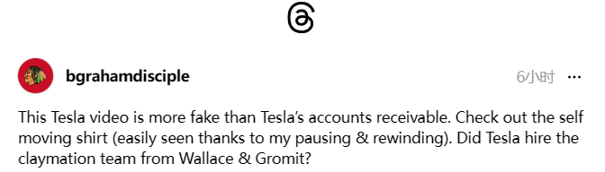 一名用户在社交媒体Threads上发表了一段慢镜头视频,显示视频中的衬衫有时会自己移动,他认为确实有证据表明这是“计算机时代的产物”。这位用户还提出灵魂质问,“特斯拉聘请了《超级无敌掌门狗》的粘土制作团队吗?”