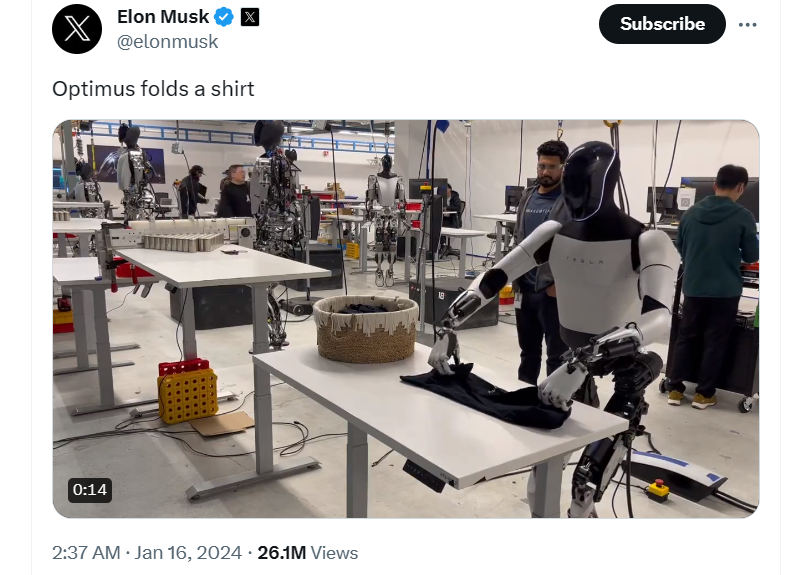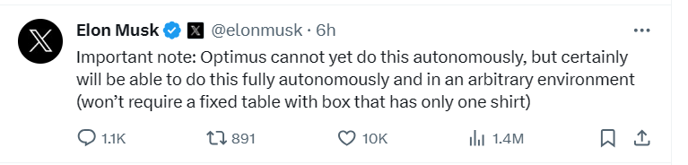 有意思的是,马斯克随即分享了一些后续信息,承认擎天柱并非自主行为。马斯克的原话是,“重要提示:擎天柱还不能自主地叠衬衫,但(未来)肯定可以在任意环境下完全自主地做到这一点(不需要一张固定桌子,且桌上的盒子里只有一件衬衫)。”