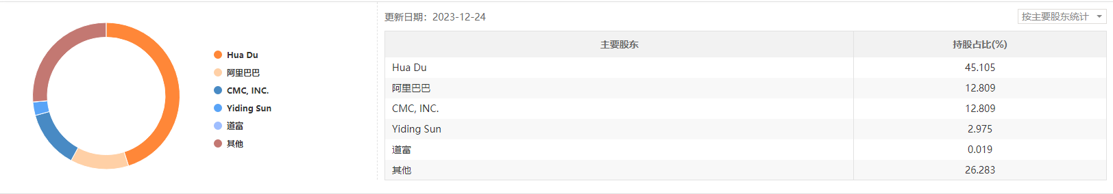 截至2023年12月24日,Hua Du(杜华)、阿里巴巴、CMC.INC(华人文化)为主要股东,其持股比例分别为45.10%、12.80%、12.80%。
