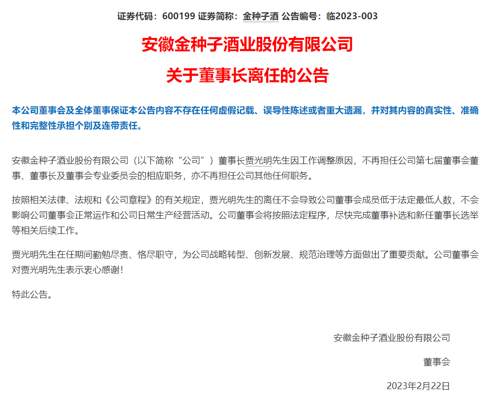 2023年年底,一则消息激起“白酒圈”的千层浪,该消息事关金种子酒前董事长贾光明的人事任免。