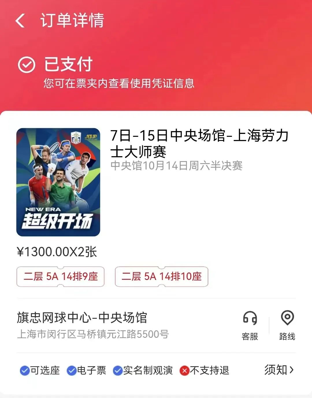 吴女士买的10月14日门票位于旗忠网球中心中央场馆看台二楼A区,每张1300元。