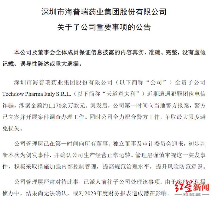 1月14日晚间,海普瑞(002399.SZ,09989.HK)发布《关于子公司重要事项的公告》称,全资子公司Techdow Pharma Italy S.R.L。(以下简称“天道意大利”)近期遭遇犯罪团伙电信诈骗,涉案金额约1170余万欧元。按最新汇率计算,涉案金额超过人民币9000万元。
