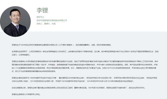 海普瑞创始人李锂,四川仁寿人,四川大学化学系本科毕业,1998年创立深圳市海普瑞药业集团股份有限公司(以下简称“海普瑞”),现任海普瑞董事长兼总裁。2020年,李锂家族以212.9亿元财富位列2020福布斯中国400富豪榜第173位。