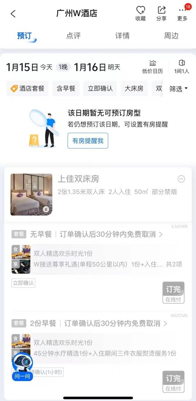 在携程平台上搜索广州W酒店,则显示今日(15日)起所有房型均“已订完”。