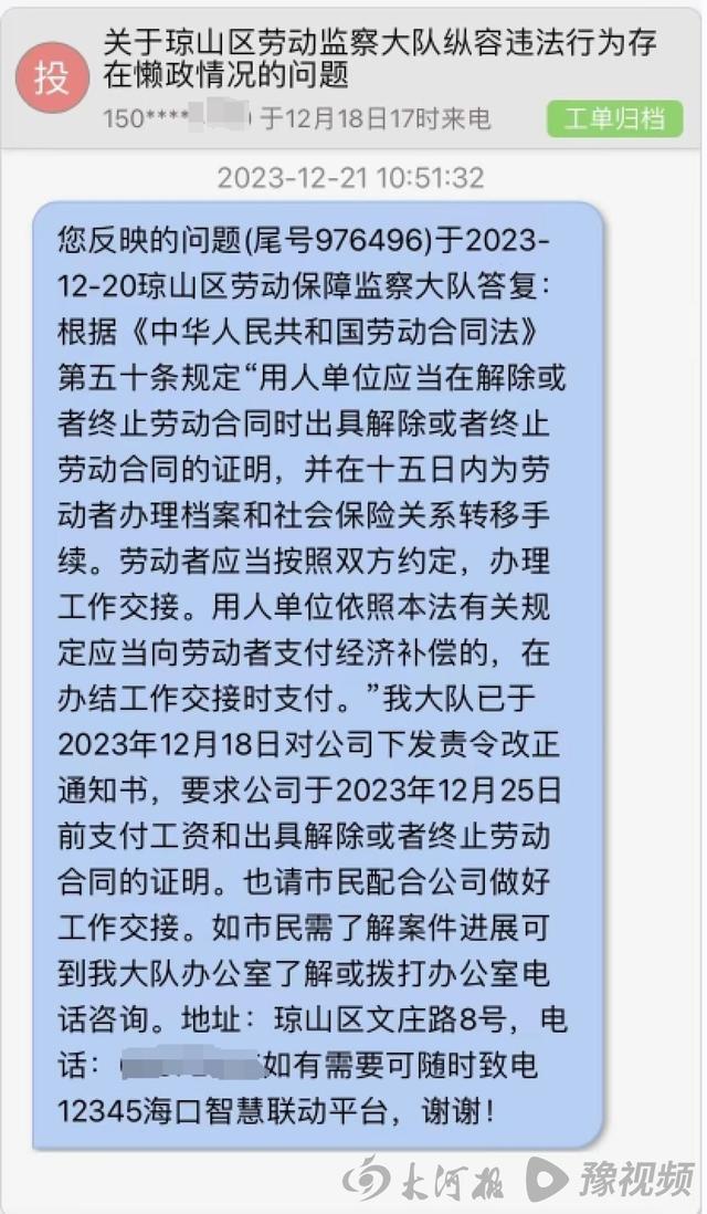 罗先生提供的一份短信截图显示,2023年12月20日海口市琼山区劳动保障监察大队答复:“我大队已于2023年12月18日对公司下发责令改正通知书,要求公司于2023年12月25日前支付工资和出具解除或者终止劳动合同的证明。”