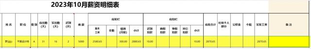 罗先生向《看见》记者表示,薪资明细表是公司财务和人事发给他的。他10月并未旷工,对于为何实发工资变成2870.65元,他不明白,这属于随意降薪。另外,表中应出勤天数为31天,实际出勤天数为16天也让记者有些疑惑。据悉,应出勤天数指的是当月扣除法定的节假日、规定的休息日后,员工当月应该出勤正常上班的天数。出勤天数31天是否把节假日、休息日也算成工作日不得而知。