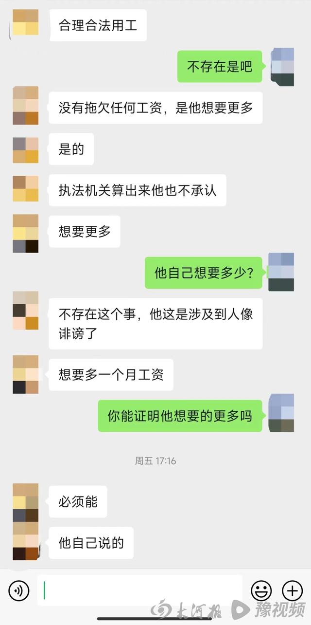 在微信中,该公司负责人表示公司是“合理合法用工”,不存在拖欠任何工资的问题。“是他想要更多”。记者询问他想要多少?该负责人称他“想多要一个月工资”,记者再次询问“你能证明他想要的更多吗”,该负责人表示“必须能”,但该负责人并未提供相关证据。