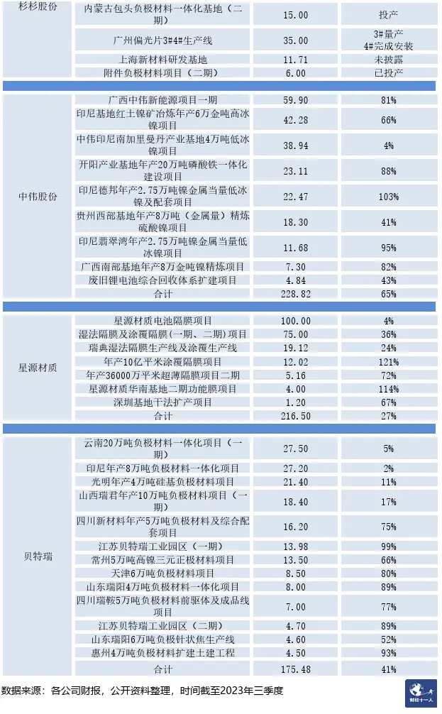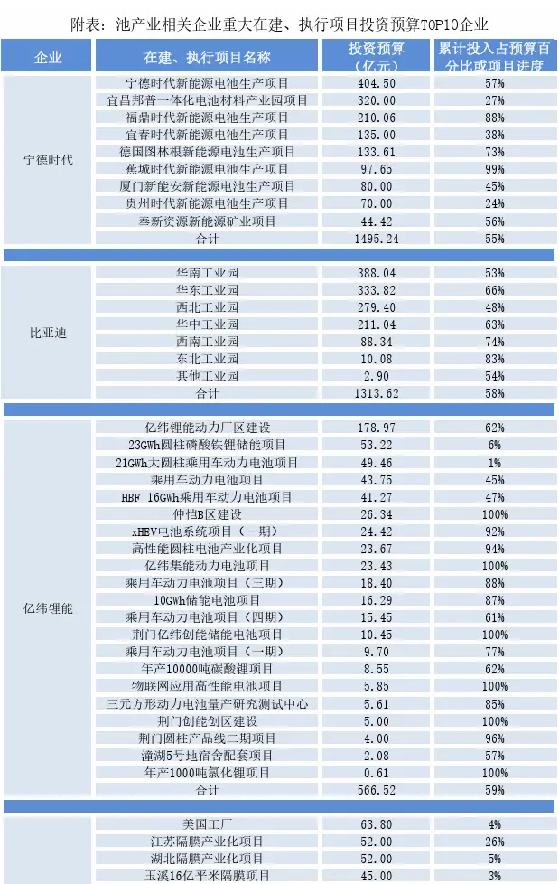 附表:电池产业相关企业重大在建、执行项目投资预算TOP10企业