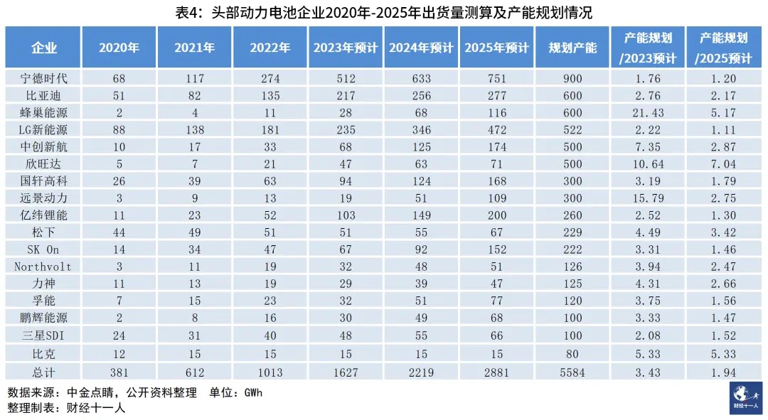 统计数据也表明头部动力电池企业的产能规划过剩的情况并不是非常严重。 以2025年预计出货量相比,头部企业的产能规划超出幅度大多不足两倍。