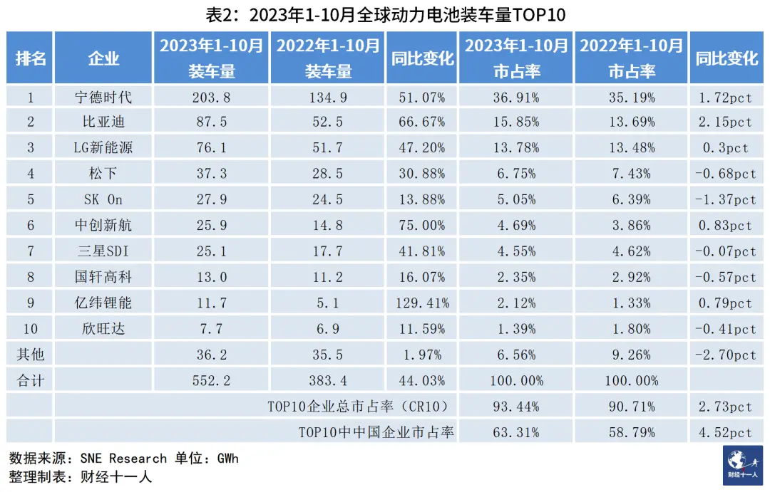 根据SNE Research公布的2023年1-10月全球动力电池装车数据,全球2023年前十个月的动力电池装车总量552.2GWh,比2022年同期增长44%,市场集中度继续提升,前十名企业总市占率(CR10)达到93.44%,在去年同期90%以上的高位基础上继续增加2.73个百分点。