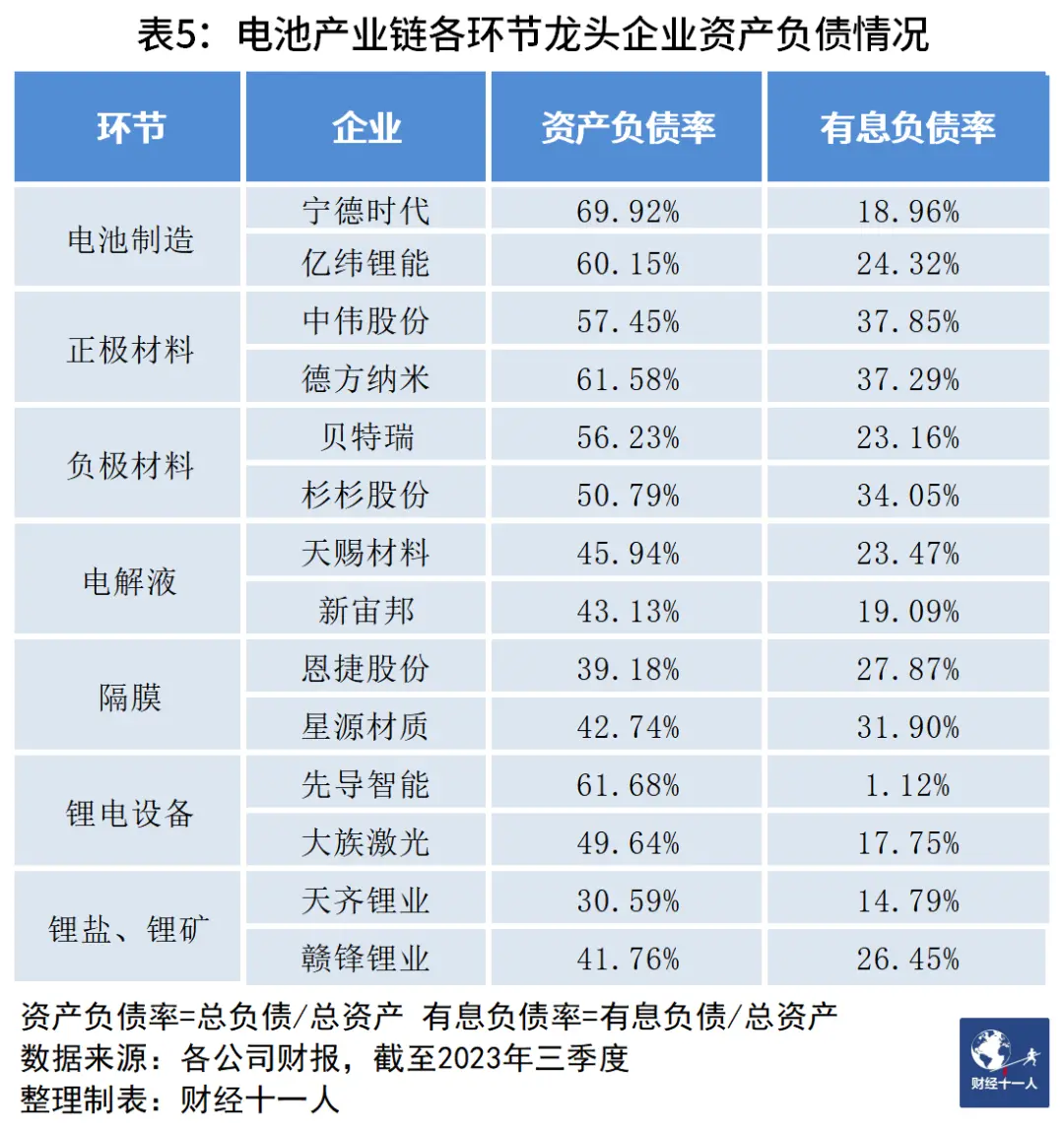 要维持快速的产能扩张,资金安全是关键保障。梳理不同产业链环节的头部企业资产负债情况可以发现,头部企业由于过去两年的量价齐升,都有比较好的现金流表现,现在的资产负债率相对比较健康。而且2023年的价格大跌是相对于2022年的高位而言,电池产业链的绝大部分头部企业依然有可观的净利润,财务健康方面并没有太大风险。