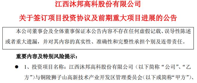 根据公告,沐邦高科与铜陵狮子山高新技术产业开发区管理委员会、铜陵高新发展投资有限公司签订了《项目投资协议书》。