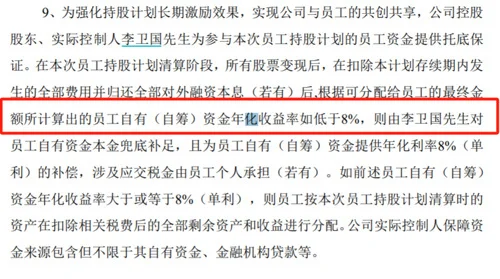 其中还显示,为强化激励作用,李卫国曾承诺为员工资金提供托底保证。李卫国表示,如果年化收益率低于8%,则由老板兜底+补偿8%的利息。