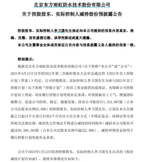 市场熟知的“防水茅”——东方雨虹,出了一个公告,它的控股股东、实际控制人李卫国,计划以大宗交易方式减持公司股份不超过5036.92万股(占公司总股本比例不超过2%)。