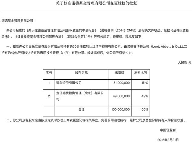 2015年3月31日,证监会公告了一则核准诺德基金变更股权的批复。据批复内容,长江证券股份有限公司将所持有的30%股权转让给清华控股有限公司,诺德安博特公司(Lord, Abbett & Co.LLC)则将持有的49%股权转让给宜信惠民投资管理(北京)有限公司。