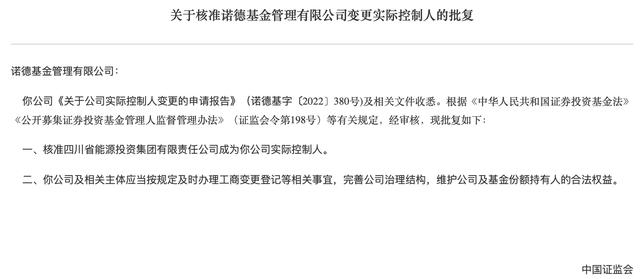 1月12日,诺德基金管理有限公司(下称“诺德基金”)公告称,经中国证券监督管理委员会(下称“证监会”)核准,诺德基金实际控制人变更为四川省能源投资集团有限责任公司(下称“四川能投”)。此次实际控制人变更不涉及公司注册资本、不涉及公司股权结构变更。