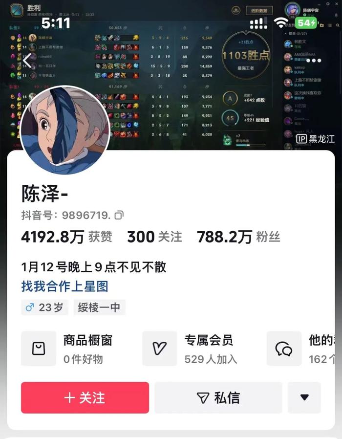 据了解,陈泽是一名颇具人气的游戏主播,在抖音上800多万粉,微博粉丝也已近40万。此前某平台上也有700多万粉,但如今该账号已无法搜到。1月12日晚9点,陈泽在抖音进行了首播。