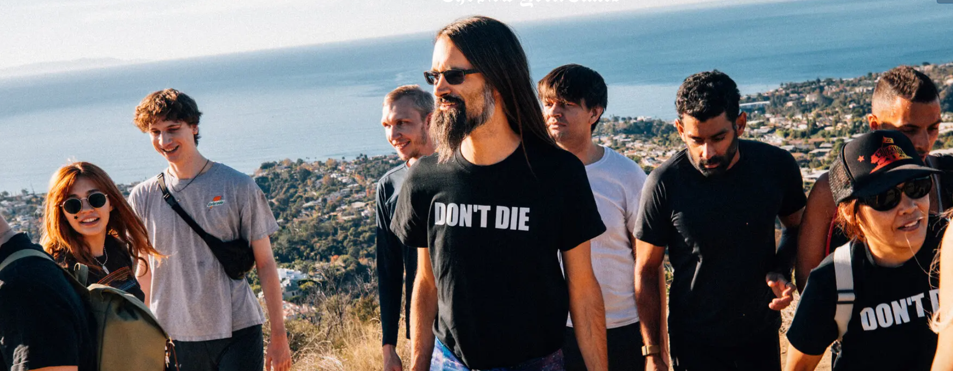 美国洛杉矶太平洋沿岸的特迈斯卡峡谷里,一群徒步者正在合影,不少人穿着黑色T恤,上面印着白色粗体文字:“不要死(Don't die)。”