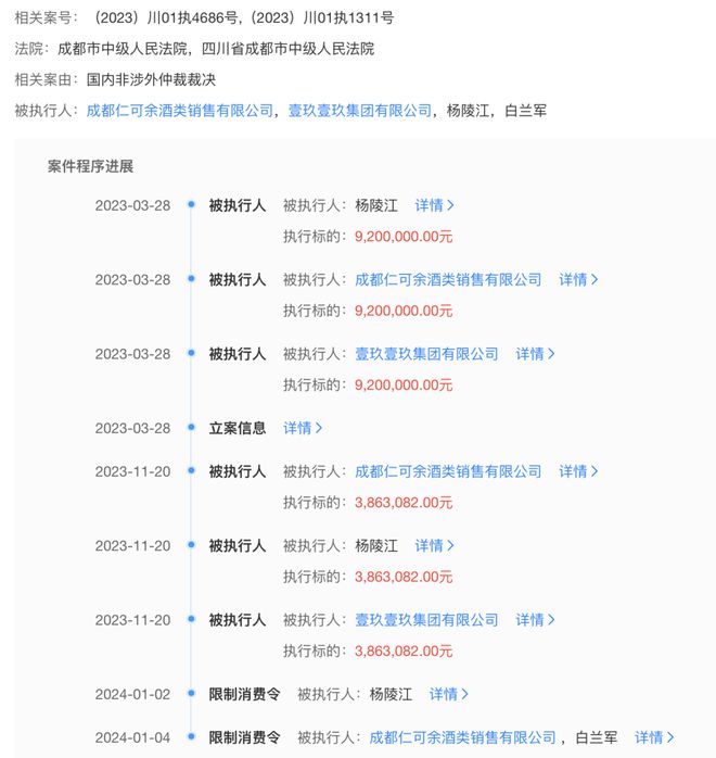 天眼查信息显示,此前的2023年3月28日,被执行人包括杨陵江以及其任法人代表的壹玖壹玖集团有限公司,和成都仁可余酒类销售有限公司,执行标的920万元。同年11月20日,新增执行标的386.31万元。