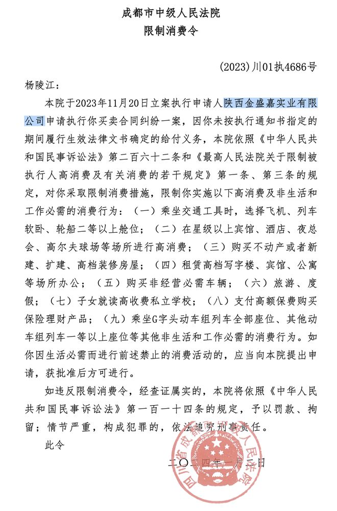 据成都市中级人民法院1月2日发布的限制消费令(2023)川01执4686号,2023年11月20日,陕西金盛嘉实业有限公司申请执行买卖合同纠纷,但杨陵江未按执行通知书指定的期间履行生效法律文书确定的给付义务,因此被法院采取限制消费措施。