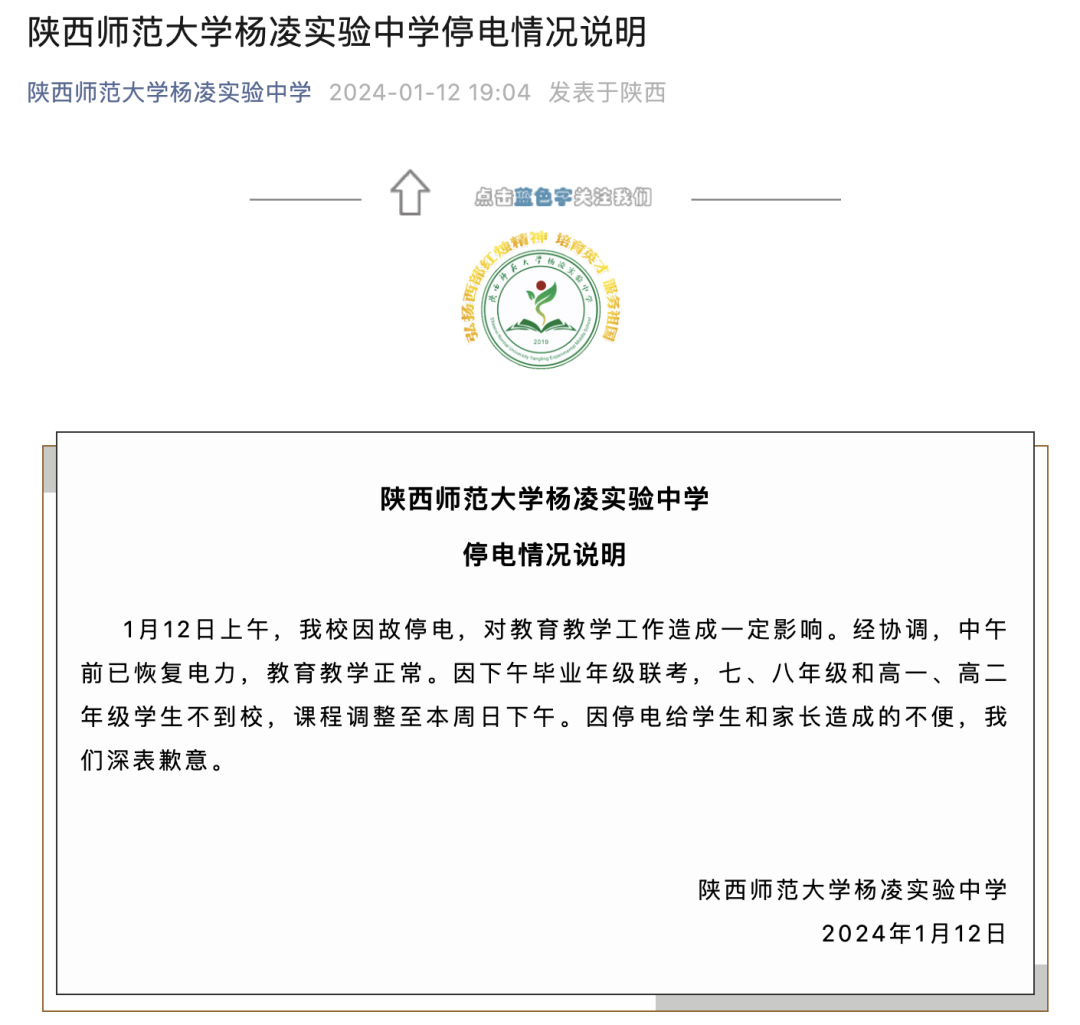 1月12日,有家长反映陕西师范大学杨凌实验中学因欠费被停电,通知家长接学生回家。