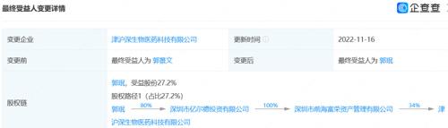 不过,企查查显示,2022年11月16日,由于郭珉接手了郭景文持有的亿尔德投资80%股权,郭珉成为亿尔德投资的控股股东,也即前海富荣的实际控制人,在津沪深医药享有27.2%的受益股份。