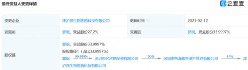 2023年2月12日,郭珉在亿尔德投资的股权比例进一步上升至99.999%,其在津沪深医药的受益股份也因此上升至33.9997%。