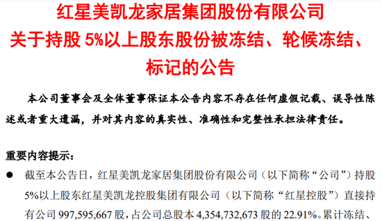 美凯龙公告显示,公司于2024年1月9日收到公司股份被部分冻结的通知,获知持股5%以上股东红星美凯龙控股集团有限公司(简称“红星控股”)所持部分公司股份被轮候冻结,经公司向中国结算上海分公司进一步查询后,获知了红星控股及其一致行动人所持公司股份被司法冻结、轮候冻结、标记的具体情况。