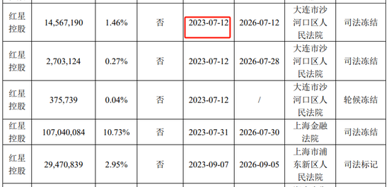 不过,从冻结发生时间来看,1月9日红星控股只是被上海金融法院轮候冻结4.02亿股,占其持股比例40.29%。而在此之前,2023年7月到12月,红星控股的持股就已经密集发生冻结,但不知公司为何迟至现在才公告。