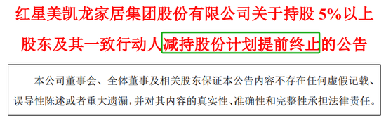 随着股份被冻结,同一日美凯龙公告,红星控股及其一致行动人提前终止去年8月抛出的减持计划。