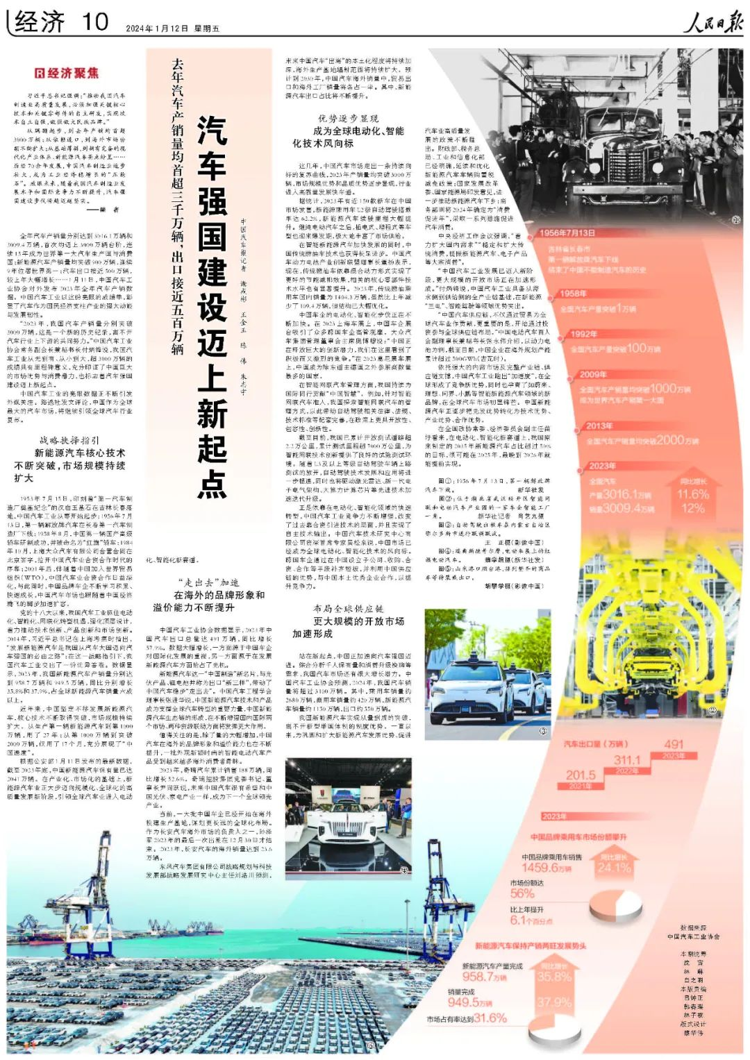 “2023年,我国汽车产销量分别突破3000万辆,这是一个新的历史纪录,离不开汽车行业上下游的共同努力。”中国汽车工业协会常务副会长兼秘书长付炳锋说,我国汽车工业从无到有、从小到大,超3000万辆的成绩具有里程碑意义,充分印证了中国巨大的市场优势与消费潜力,也标志着汽车强国建设迈上新起点。