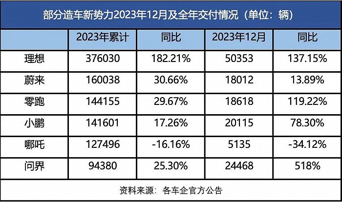2024年元旦,多家造车新势力先后公布2023年全年成绩单。理想汽车以37.6万辆稳拿第一,理想汽车CEO李想则表示,将在2024年挑战80万年销量、10万月销量的目标;紧随其后的蔚来汽车全年共交付新车160038辆,同比增长30.7%,在造车新势力交付排行榜中排名第二;小鹏汽车则在2023年全年共交付新车141601辆,同比增长17%,虽然年交付量略低于零跑汽车,但近几个月稳健增长,趋势向好。